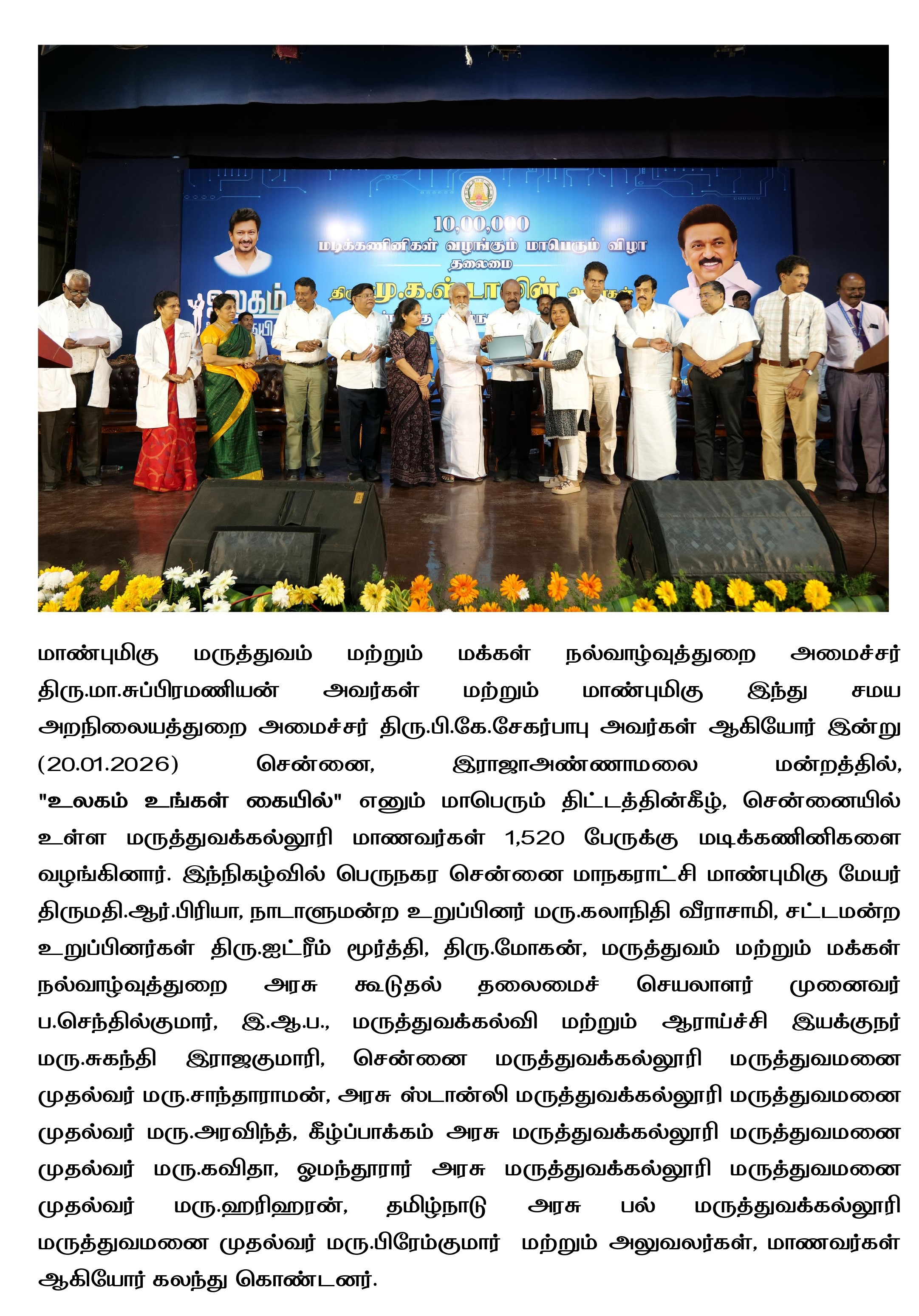 மாண்புமிகு மேயர் திருமதி ஆர்.பிரியா அவர்கள், பெருநகர சென்னை மாநகராட்சியின் பல்வகை பயன்பாட்டிற்காக ரூ.34.40 கோடி மதிப்பீட்டில் 64 புதிய வாகனங்களின் பயன்பாட்டினை இன்று (12.01.2026) கொடியசைத்துத் தொடங்கி வைத்தார்.