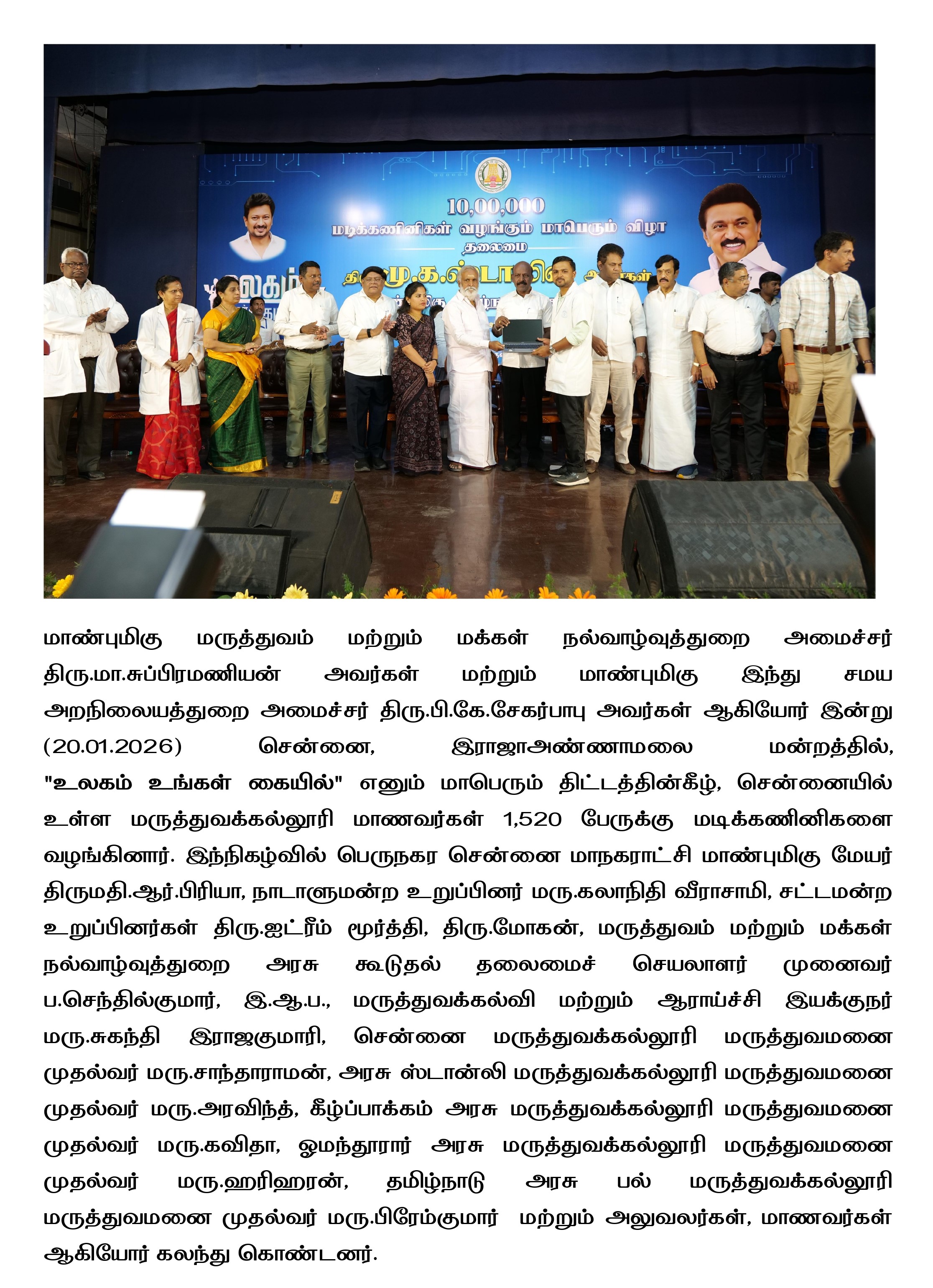 மாண்புமிகு மருத்துவம் மற்றும் மக்கள் நல்வாழ்வுத்துறை அமைச்சர் திரு.மா.சுப்பிரமணியன் அவர்கள், அப்துல் ரசாக் தெருவில் சிங்கார சென்னை 2.0 நிதியில் ரூ.23.13 கோடி மதிப்பீட்டில் நவீன வசதிகளுடன் காய்கறி அங்காடி கட்டும் பணியினை இன்று (12.01.2026) அடிக்கல் நாட்டித் தொடங்கி வைத்தார்.