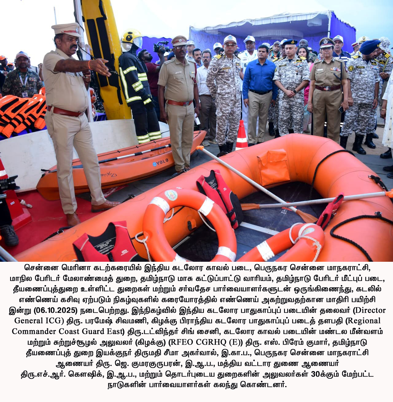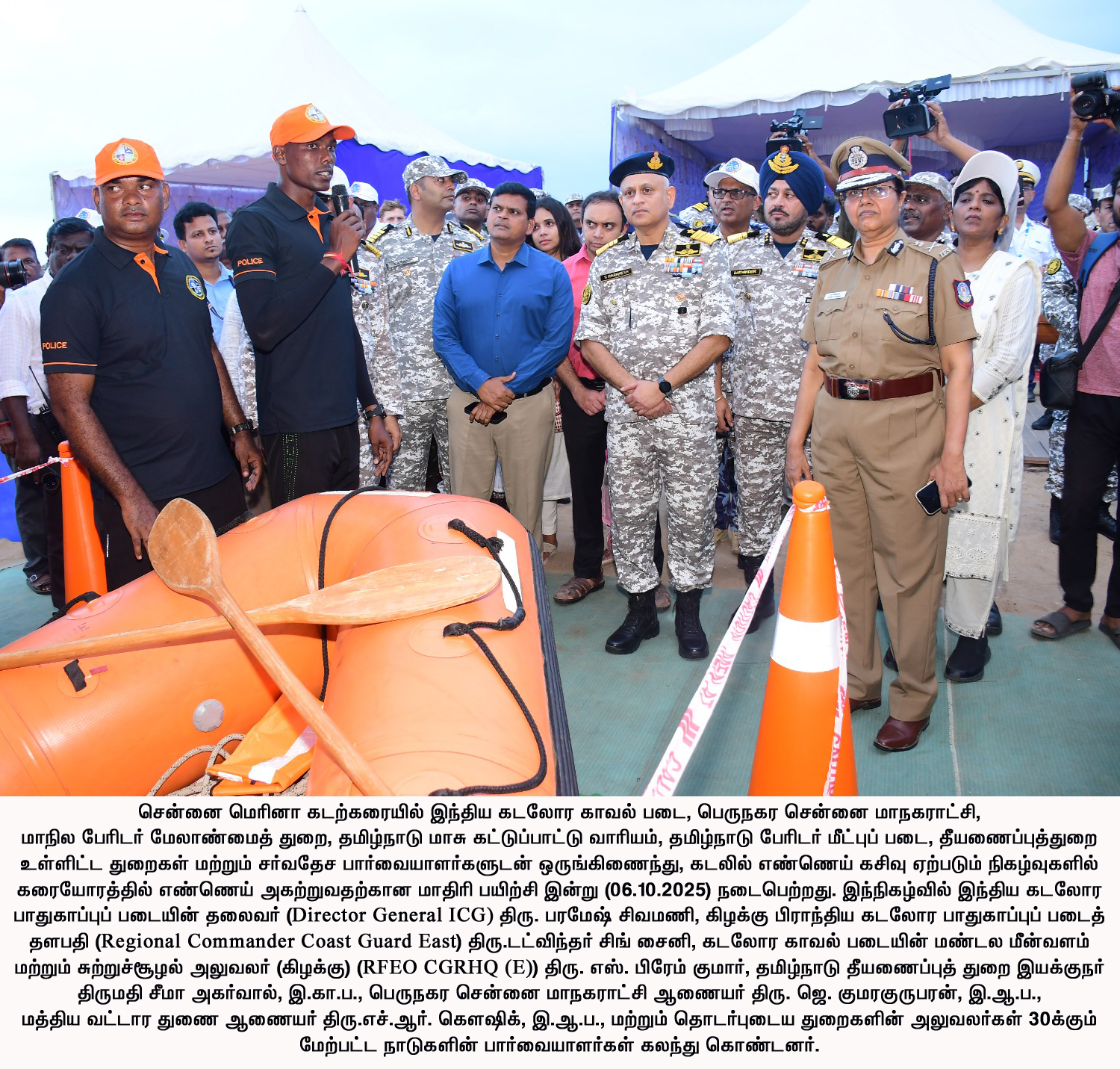 தேசிய மாசு தடுப்பு தினத்தை முன்னிட்டு, சென்னை மெரினா கடற்கரையில் கடலில் எண்ணெய் கசிவு ஏற்படும் நிகழ்வுகளில் கரையோரத்தில் எண்ணெய் அகற்றுவதற்கான மாதிரி பயிற்சி இன்று (06.10.2025) நடைபெற்றது