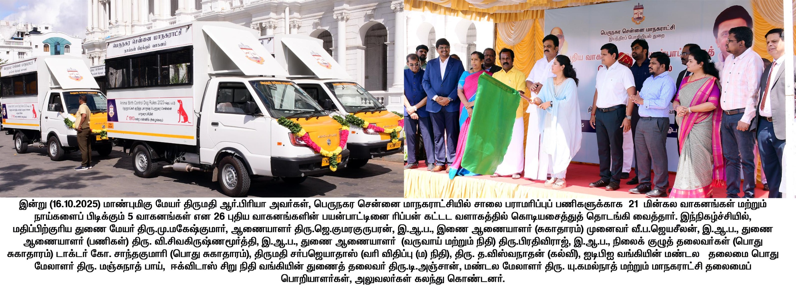 மாண்புமிகு மேயர் திருமதி ஆர்.பிரியா அவர்கள், பெருநகர சென்னை மாநகராட்சியில் 26 புதிய வாகனங்களின் பயன்பாட்டினை இன்று (16.10.2025) கொடியசைத்துத் தொடங்கி வைத்தார்.
