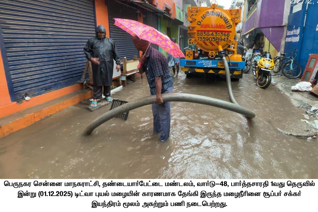 மாண்புமிகு தமிழ்நாடு முதலமைச்சர் அவர்களின் அறிவுறுத்தலின்படி, பெருநகர சென்னை மாநகராட்சி சார்பில் டிட்வா புயல் மழையை எதிர்கொள்வதற்கு தேவையான முன்னெச்சரிக்கை நடவடிக்கைகள் மேற்கொள்ளப்பட்டது.