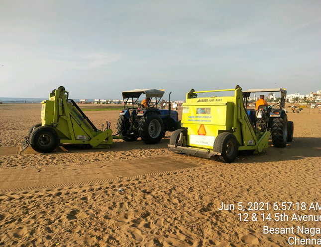 8 Nos. of Beach Cleaning machines are procured under Swadesh Dharshan Scheme of Tourism department of which , 5 Nos. are deployed in Marina beach and 3 Nos. in Besant Nagar Beach to maintain cleanliness by removing garbage, Plastic items, Bottles, Waste paper from the sand.